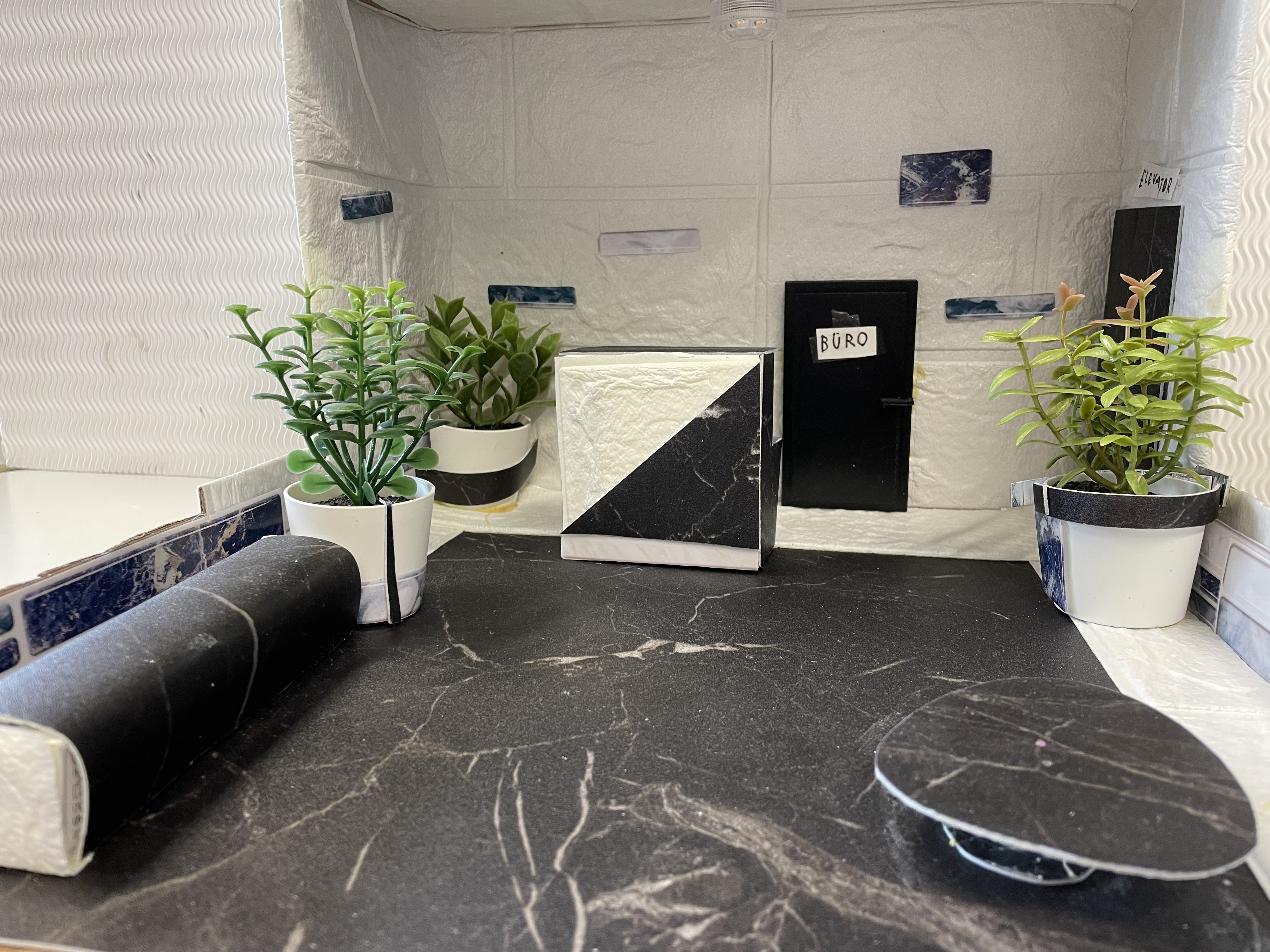 Im Kunstunterricht gestaltete die Klasse 7e fantasievolle Miniaturzimmer im Schuhkarton. In Kleingruppen entstanden detailreiche Räume – von modernen Büroräumen bis hin zur kompletten Traumwohnung.